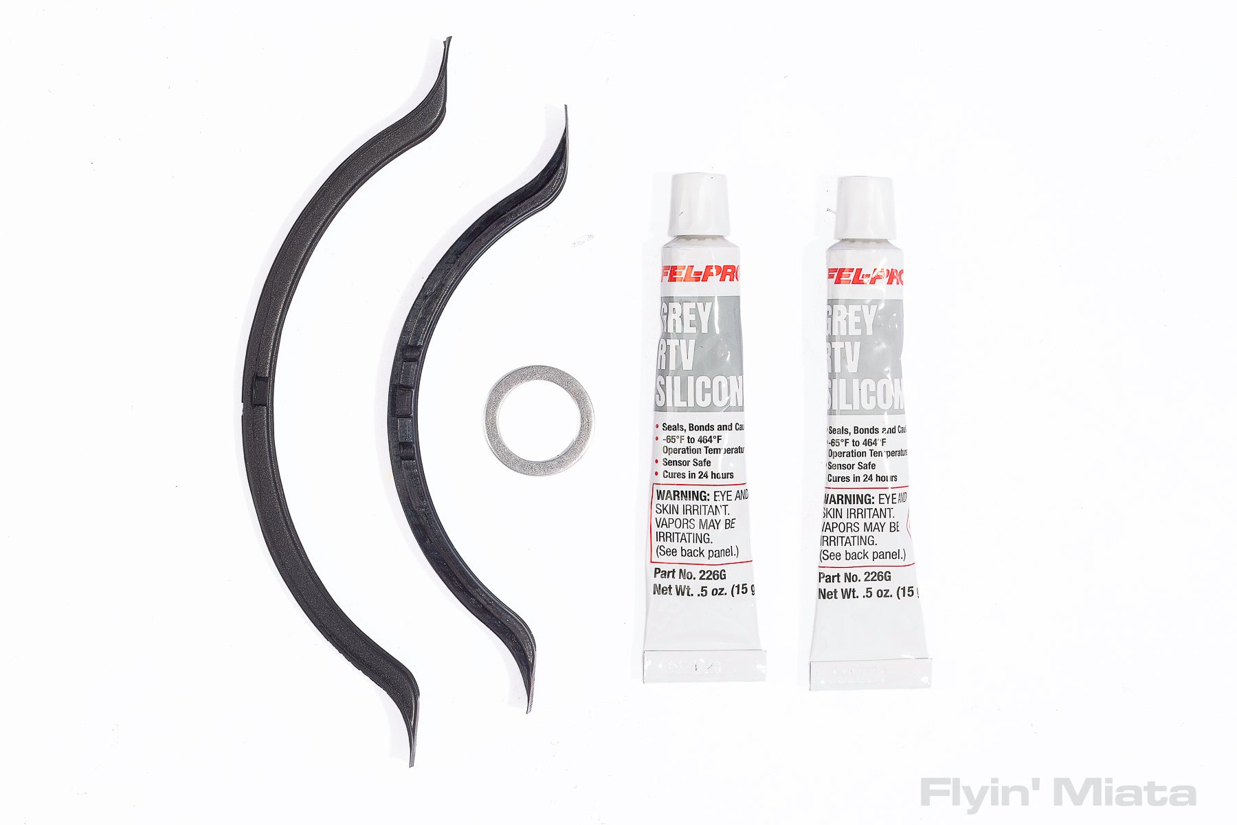 The Miata oil pan is sealed with two rubber seals and RTV. They rarely leak unless disturbed, but if you've pulled the pan you'll need this kit. Includes two quality aftermarket seals (equivalent to Mazda parts B6F4-10-427 and B6F4-10-428) as well as two tubes of the correct sealant.