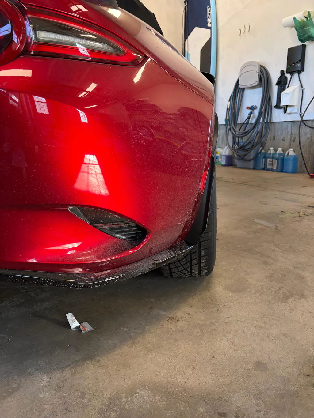 On the front flaps I used my Dremel to remove small amounts of material on the lower two holes allowing them to line up better with the holes in the fender wells. On both rear flaps I trimmed off a small amount of the sticky tape (bottom of the long vertical strip on the outside edges) so that no tape would protrude and be visible once mounted. Final result was excellent. Looks factory with just the right amount of protection and without making my ND3 Club RF look like a rally car.