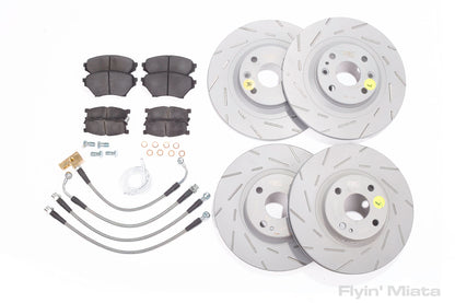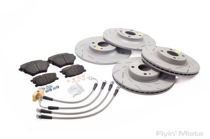 Includes a full set of pads, rotors, our stainless steel brake line kit, and a bleeder hose at minimum. There are some shipping limitations on the brake fluid so we've made that optional.