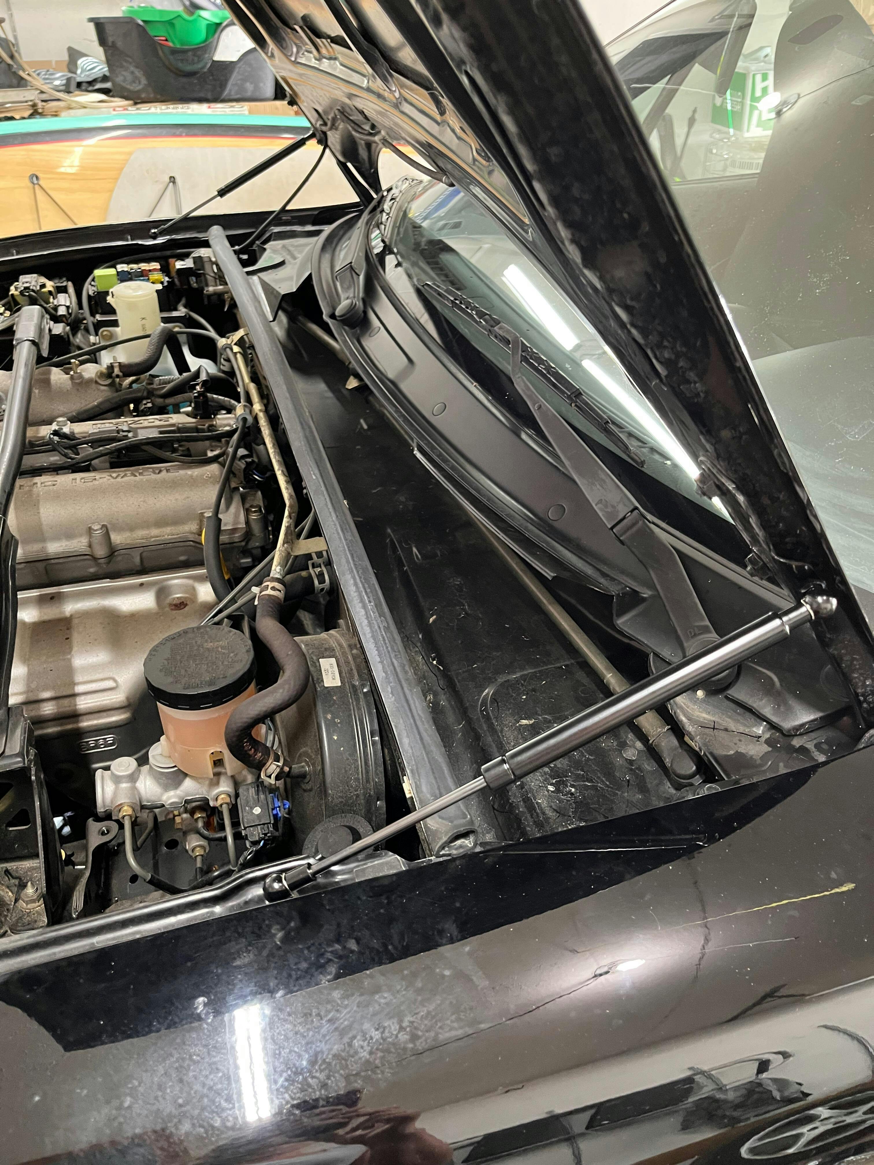 Includes a pair of low power hydraulic struts so that the hood is lifted evenly. A single strut has a tendency to lift one side of the hood slightly when the hood is closed and twist the hood when it's up. Because each strut only has to support half the hood's weight, it can be smaller and more compact.
