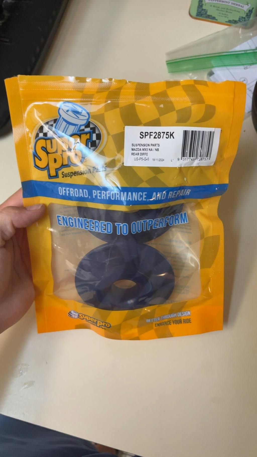 The differential is mounted in the car with some surprisingly flexible rubber bushings. Replacing these with stiffer bushings will cut down on differential movement, but they're a headache to install. Looking for an easy answer? Enter these bushing inserts. These inserts, made by SuperPro, fill in the voids in the stock bushings to minimize the movement of the differential - this actually makes your shifting more precise due to the way the Miata's drivetrain is mounted. They're a pretty easy install, as you just have to lower the differential enough to get it off the studs in the subframe, slip the smaller part into place, then put the bottom piece in place. With full replacement bushings, you need to remove the differential altogether then remove the stock bushings (which typically requires fire. Seriously.). A definite plus for competition cars - you don't want to hit 5th instead of 3rd in the heat of competition!