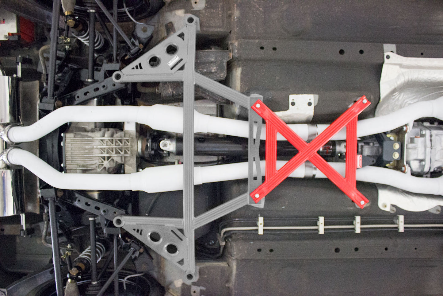 IL Motorsports has developed this X as a replacement for the weedy little factory one. This will make a big difference to the rigidity of the chassis by "closing the box" under the car. Loss of ground clearance is minimal and the powdercoated aluminum won't rust.